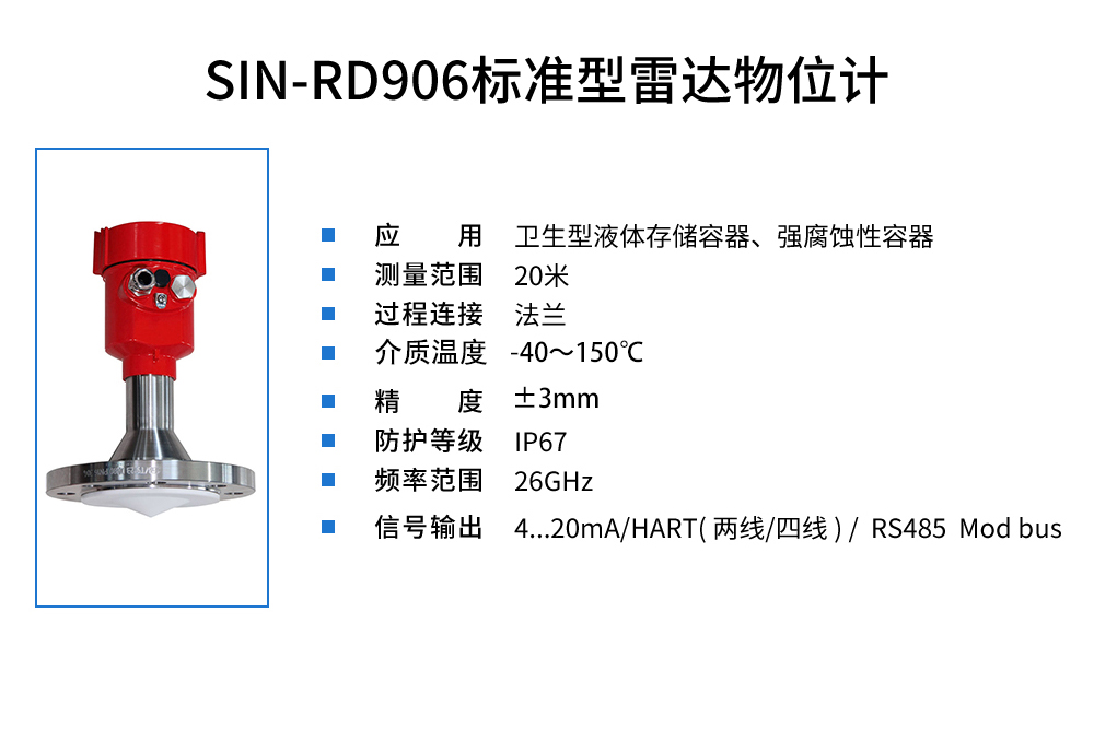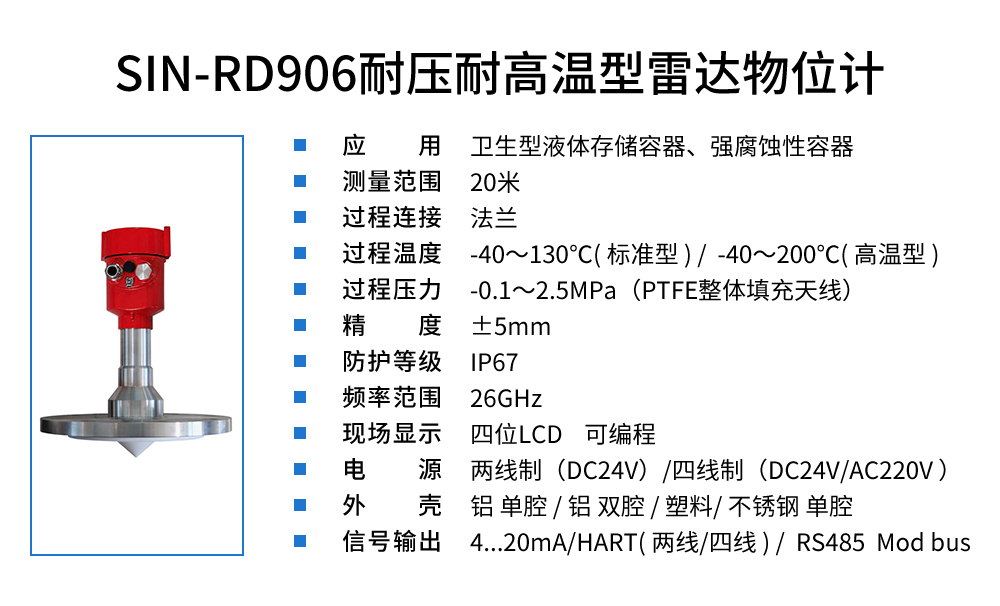 90 系列傳感器是 26G 高頻雷達式物位測量儀表,測量最大距離可達 80 米。天線被進一步優化處理,新型快速的微處理器可以進行更高速率 的信號分析處理,使得儀表可以用于各種強腐蝕性液體的測量。