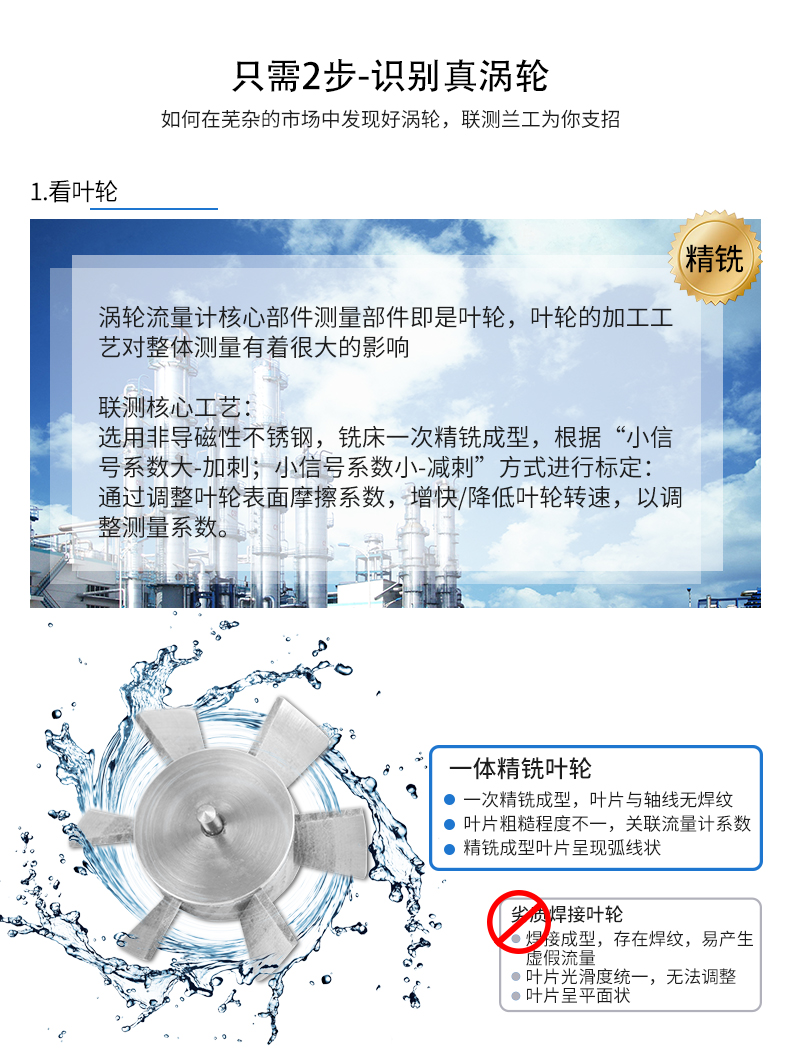 流體流經傳感器殼體,由于葉輪的葉片與流向有一定的角度,流體的沖力使葉片具有轉動力矩,克服摩擦力矩和流體阻力之后葉片旋轉,在力矩平衡后轉速穩定,在一定的條件下,轉速與流速成正比,由于葉片有導磁性,它處于信號檢測器(由永久磁鋼和線圈組成)的磁場中,旋轉的葉片切割磁力線,周期性的改變著線圈的磁通量,從而使線圈兩端感應出電脈沖信號,此信號經過放大器的放大整形,形成有一定幅度的連續的矩形脈沖波,可遠傳至顯示儀表,顯示出流體的瞬時流量或總量。
