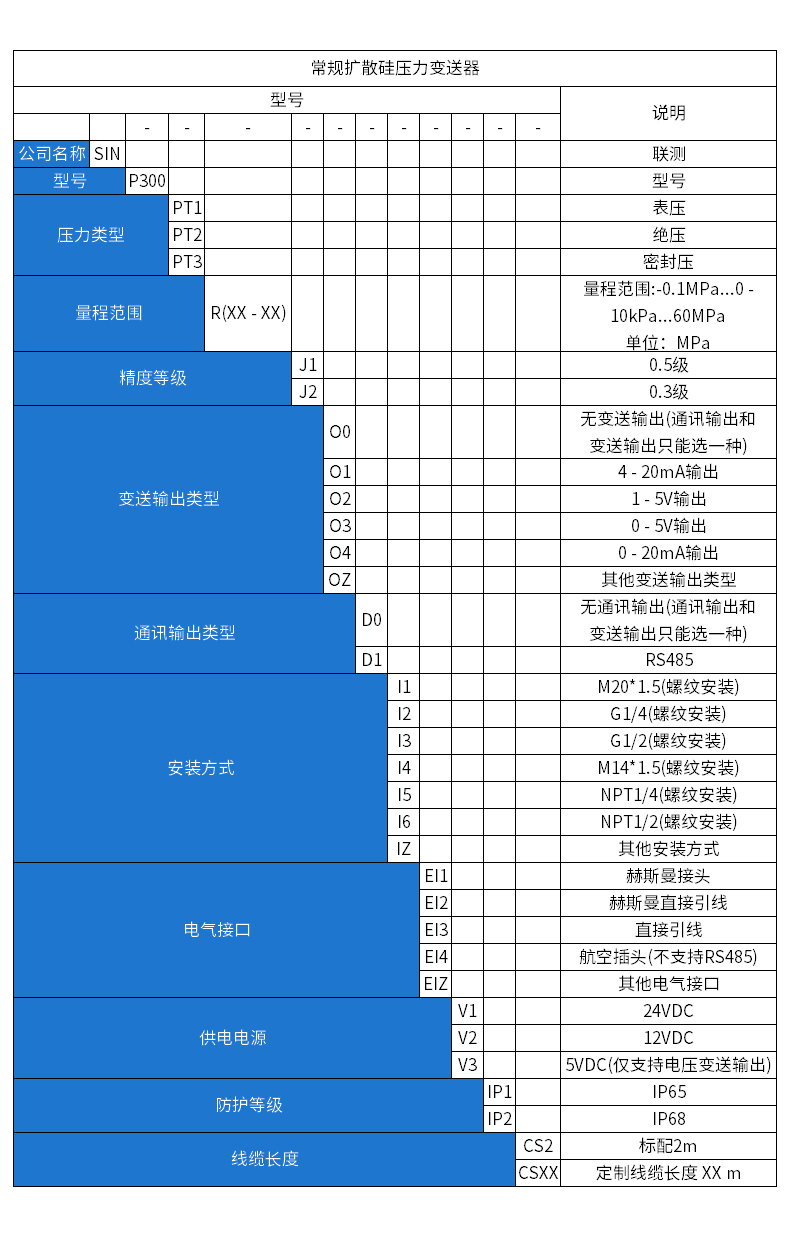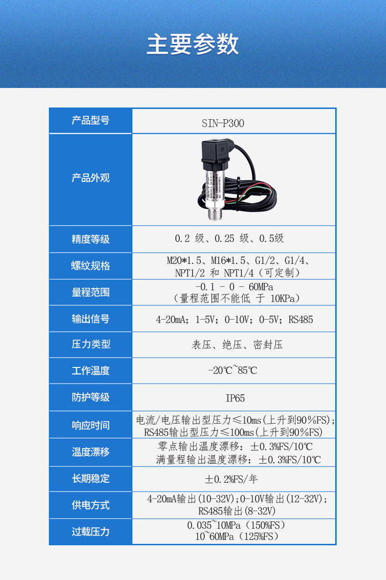 SIN-P300通用型壓力變送器德國進口硅芯片,精度高性能穩定;SIN-P300型通用型壓力變送器采用擴散硅壓力芯體作為敏感元件,內置處理電路將傳感器毫伏信號轉換成標準電壓﹑電流信號輸出,可直接與計算機、控制儀表﹑顯示儀表等相連。選用高穩定性和高可靠性的壓阻式壓力傳感器和高性能的變送器專用電路,整體性能穩定可靠,可進行遠距離信號傳輸。采用一體化全不銹鋼結構,經過多次不銹鋼焊接,實現了全固態設計,安裝方便,具有高抗振性和抗沖擊性,在惡劣環境中可以長期使用。廣泛應用于工業自動化設備配套以及石油、化工、冶金、電力等控制領域。