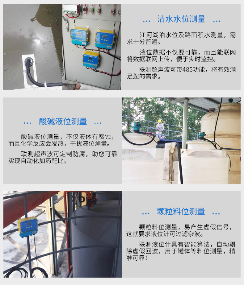 在測(cè)量中超聲波脈沖由傳感器(換能器)發(fā)出,聲波經(jīng)液體表面反射后被同一傳感器接收或超聲波接收器,通過(guò)壓電晶體或磁致伸縮器件轉(zhuǎn)換成電信號(hào),并由聲波的發(fā)射和接收之間的時(shí)間來(lái)計(jì)算傳感器到被測(cè)液體表面的距離。 由于采用非接觸的測(cè)量,被測(cè)介質(zhì)幾乎不受限制,可廣泛用于各種液體和固體物料高度的測(cè)量。