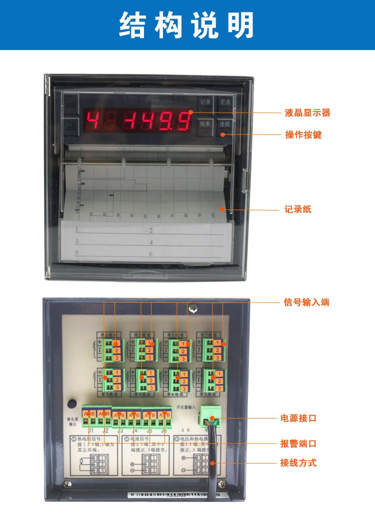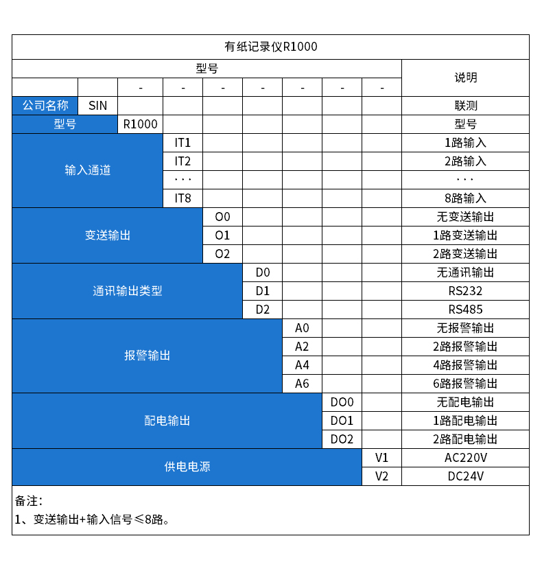 SIN-R1000有紙溫度記錄儀最多具有8路輸入通道,2路模擬量輸出,通道之間采用點點隔離;均可直接選擇接收多種熱電偶、熱電阻、壓力變送器、電壓、電流信號